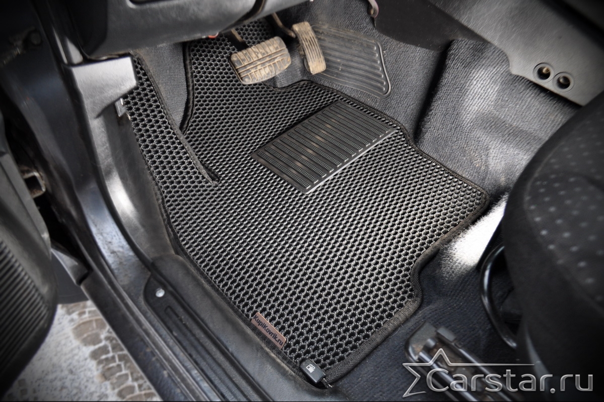 Толщина ковриков EVA составляет 10-12 мм. Глубина ячеек 7-8 мм. Такая толщина ковриков позволяет им служить довольно долго, не протираясь до 3 лет. А благодаря такой глубине ячеек коврик EVA площадью 1 кв.м. способен захватить около 3,5 л жидкости, сохраняя в чистоте вашу обувь и обивку салона.