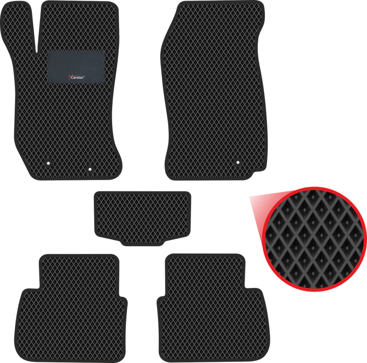 Изделия EVA имеют специальную ячеистую структуру (ячейки глубиной 8 мм), которая эффективно задерживает грязь и воду, оставляя вашу обувь и поверхность обивки салона или багажника абсолютно чистыми. Также эти ячейки очень легко и быстро очищаются без применения специальных инструментов, в том числе, при помощи бесконтактной мойки.