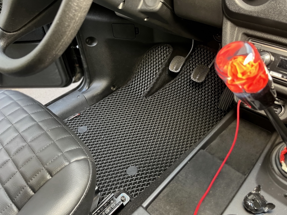 Обратная сторона резиновой основы покрыта шипами противоскольжения. Также присутствуют оригинальные клипсы крепления коврика к полу. Если в полу предусмотрены крючки, то в коврике устанавливаются ответные люверсы. Коврик надёжно держится на месте, не ёрзает, не попадает под педали, не создаёт аварийных ситуаций.